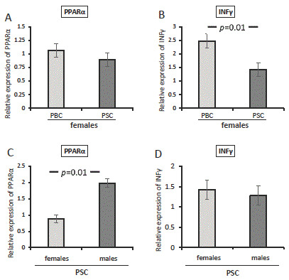 Since a strong male predisposition has been observed in PSC patients, we conducted an additional analysis for females with PBC or PSC. When PPAR-α mRNA was evaluated, there was no difference between PBC and PSC females (p = 0.37; Figure 3A). However, a higher expression of IFNγ was observed in females with PBC compared with those with PSC (p = 0.01; Figure 3B). In contrast, when the analysis was made for the entire group of PSC patients, females had lower levels of PPAR-α compared with males (p = 0.012; Figure 3C), but no difference in the relative expression of IFNγ was observed (p = 0.68; Figure 3D).