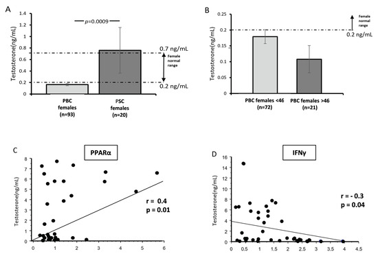 The serum concentration of testosterone in females with PBC and PSC. Bar charts show considerably lower concentrations of testosterone in the sera of female patients with PBC than in females with PSC (A). Testosterone levels were below the normal range in females with PBC, and there was no difference between younger (PBC < 46 years old) and older women (PBC > 46 years old). The dotted lines represent the normal range for females (B). The serum concentration of testosterone correlated positively with PPAR-α mRNA (C) and negatively with IFNγ mRNA (D). Dots illustrate each patient.
