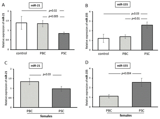 As some miRs, including miR-155 and miR-21, can inhibit PPAR-α gene activity, and the expressions of these miRs have been reported to be gender-dependent, we investigated the levels of these miRs in PBMCs. The relative expression of miR-21 was lower in PSC patients than in controls and PBC patients (p = 0.02 and p = 0.005, respectively; Figure 5A). The difference between the diseases was similar when the analysis was made only with female patients (PSC vs. PBC, p = 0.03; Figure 5B). In contrast, the expression of miR-155 was higher in PSC patients compared with PBC patients (PSC vs. PBC, p = 0.005; Figure 5C), and this disease-specific variation was also maintained when only female patients were evaluated (PSC vs. PBC, p = 0.004; Figure 5D).