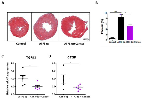 Next, we sought to examine the tumors’ effect on cardiac fibrosis, another hallmark of cardiac remodeling and heart failure seen in the ATF3 transgenic mouse model. Thus, heart sections were stained for fibrosis using Masson’s trichrome staining (Figure 2A). Consistently, quantitative analysis of fibrosis deposition showed a decrease in fibrosis levels in the tumor-bearing mice (Figure 2B). Similarly, a decrease in the expression of fibrosis hallmark gene markers tumor growth factor (TGFβ3) and connective tissue growth factor (CTGF) accompanied the decrease in cardiac fibrosis in the tumor-bearing mice (Figure 2C,D).