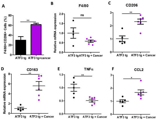 Tumor-bearing ATF3 tg mice exhibit M1 to M2 macrophage polarization in the heart. (A) Flow cytometry analysis of cardiac M2 macrophages (F4/80 + CD206+) in either tumor-free or tumor-bearing ATF3 tg mice (n = 4 per group). Macrophage marker F4/80. Gating strategy can be found in Figure S2. (B), M2 macrophage markers CD206 and CD163 (C,D), M1 macrophage marker TNFα (E) and M2-polarizing cytokine CCL2 (F) levels were measured by qRT-PCR using cDNA derived from heart mRNA of either ATF3 tg or tumor-bearing ATF3 tg mice and normalized to the Hsp90 housekeeping gene. Results are presented as mean ± SEM; Student’s t-test was performed. * p < 0.05, ** p < 0.01, ns is for non-significant changes.