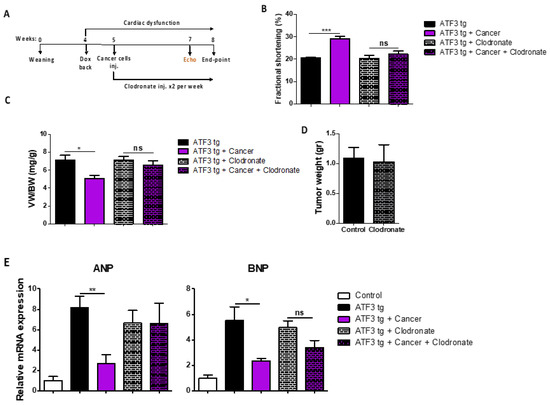Cardiac macrophage depletion results in the loss of the tumor-dependent beneficial effect on cardiac function of ATF3 tg mice. (A) Experimental timeline. Four groups were included in this experiment: ATF3 tg and tumor-bearing ATF3 tg mice injected with either saline- or clodronate-containing liposomes (n = 5 each). (B) Echocardiography was performed prior to sacrifice and the fractional shortening percent (FS%) was calculated according to the parameters in Supplementary Table S3. (C) The ventricular/body weight ratio (VW/BW). (D) Tumor weight (gr) of saline- or clodronate-containing injected groups. (E) Hypertrophic hallmark genes ANP and BNP levels were measured by qRT-PCR using mRNA derived from heart mRNA of the experimental groups and normalized to the Hsp90 housekeeping gene. Results are presented as relative to non-transgenic mice indicated as control. Mean ± SEM; one-way ANOVA followed by Tukey post-test (B,C,E) or Student’s t-test (D) were performed. * p < 0.05, ** p < 0.01, *** p < 0.001. Non-significant differences are indicated as “ns”.