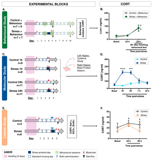 Experimental blocks with an acute WIRS protocol and evolution of CORT levels. (A) First experimental block to analyse the evolution of animal behaviour with a WIRS protocol. On Day 5 of the experiment, a subset of the control (n = 7) and stressed (n = 7) animals were sacrificed. The remaining control and stressed animals were sacrificed on Day 10. (B) CORT levels. No significant differences were observed 24 h after the application of an acute stressor, but significant differences were observed 90 min after finishing the behavioural tests in both behavioural groups, indicating a possible stressor effect of these tests. ‘a’ and ‘b’ indicate significant differences (p ≤ 0.05) in ‘Control + Behaviour’ or ‘Stress + Behaviour’ animals compared to the previous assessment without behavioural testing using repeated-measures ANOVA. (C) Second experimental block for molecular studies. The left hippocampus (Hippoc.) of each animal was used for the cytokine study and the right hippocampus was used for mass protein determination and validation by Western blotting. (D) CORT levels increased 10 and 30 min after stress application (Student’s t tests). The continuous lines represent the data for all groups, since the treatment was the same up to that time. The dashed lines refer to the means obtained at 1 h (Control and Stress 1 h) and 24 h (Control and Stress 24 h) after the application of the stressor for each group. (E) Third experimental block to study the effects of acute stress on neurogenesis and the hippocampal microglial response. (F) Significant differences in CORT levels were observed 24 and 28 h after the application of an acute stressor (environmental treatment factor from repeated-measures ANOVA). * p ≤ 0.05; *** p ≤ 0.005; **** p ≤ 0.0005 degrees of significance between two measures (Control vs. Stress).