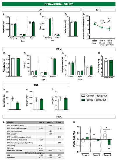 Acute WIRS-type stress exposure has an anhedonic effect at the behavioural level. Along with stress, a battery of behavioural tests modelling depression and anxiety were applied. (A–C) Basal levels of animals’ locomotor activity in the OFT. (D) Preference for saccharin assessed by SPT at baseline (Test I), 24 h post-stress (Test II) and 6 days post-stress (Test III). The red discontinuous line indicates the minimum threshold of preference for the 0.05% saccharin solution. Anxiety levels (E), locomotor activity (F,G), and time/frequency ratio on open arms (H) of the animals in the EPM. (I–K) Immobility, energy and power of movement measures in the TST. (L) Data from the PCA performed with relevant behavioural outcomes. Negative scores indicate an inverse correlation to the component (Comp.). KMO = 0.57; χ2 = 243.20; p = 0. In addition, Student’s t-statistics for PCA scores in each component are provided. (M) PCA scores for each component and group (‘Control + Behaviour’ and ‘Stress + Behaviour’). * p ≤ 0.05; ** p ≤ 0.01; *** p ≤ 0.005 differences between groups using Student’s t test.