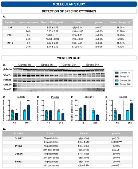 Western blots validate the effects of acute stress on the hippocampal protein profile measured by Q-Orbitrap-MS. (A) Cytokines studied with Luminex technology. (B) Representative micrograph of Western blot (consult Figure S2 for complete membranes) of proteins whose abundance (as measured by Q-Orbitrap-MS) was modified 1 h and 24 h post-acute stress (n = 5, for each group). Western blot analysis demonstrated low levels of GLUR7 in the hippocampus at 1 h following acute WIRS-type stress exposure (C) and Pi4k2a at 24 h (D). Furthermore, Western blot analysis demonstrated high levels of UBE2H in the hippocampus at 1 h following acute WIRS-type stress exposure (E) and Smad3 at 24 h (F); * p ≤ 0.05, ** p ≤ 0.01; *** p ≤ 0.005 differences for the stress group compared to their respective controls. (G) Statistical results of protein determinations by Western blot * p ≤ 0.05, *** p ≤ 0.005 differences for the stress group compared to their respective controls.