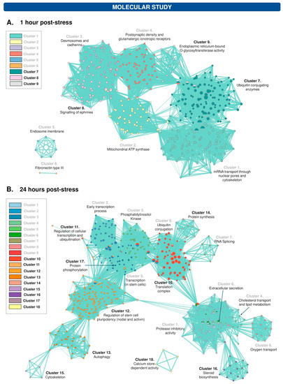 Acute stress induced an impairment of the hippocampal protein profile. Functional network in the context of 1 h (A) and 24 h (B) after the application of the acute stressor. The nodes (circles) indicate cellular functions or components in which the altered proteins are involved. Thus, each node has an identity in one or several clusters, represented by one or several colours. Clusters with grey font indicate underexpressed functions, and black font indicates overexpressed functions.