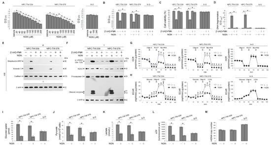 Dysfunction of glycolysis and mitochondrial oxidative phosphorylation (OXPHOS) by naringenin (NGN) confers apoptosis in nasopharyngeal carcinoma (NPC) cells. (A) The effect of NGN on NPC and Smulow–Glickman (S-G) cell growth. Cells treated with vehicle (−) or the indicated concentrations of NGN for 36 h. The 3-(4,5-dimethylthiazol-2-yl)-2,5-diphenyltetrazolium bromide (MTT) assay determined cell growth. (B–F) The effects of NGN on the induction of NPC cell growth inhibition and apoptosis. After 36 h treatment with (−), NGN (160 μM), Z-VAD-FMK (8 μM) or NGN (160 μM) and Z-VAD-FMK (8 μM), cell growth and viability were determined by the MTT and flow cytometric analysis of PI uptake, respectively. DNA fragmentation was determined using a Cell Death Detection enzyme-linked immunosorbent assay (ELISA) kit. Annexin V-biotinylated vehicle- or NGN-treated cells were fractionated by subcellular fractionation centrifugation to isolate the plasma membrane (M) fraction. The levels of the indicated proteins in the lysates of (−)-, NGN-, -Z-VAD-FMK, and the NGN plus Z-VAD-FMK co-treated M fraction were determined by Western blot analysis using streptavidin-horseradish peroxidase (HRP) and specific antibody to Annexin V or cadherin. Antibody against cadherin was used as an internal control for the plasma membrane. The levels of phosphorylated histone H2A.X (Ser 139) (p-γ-H2AX (Ser 139)), H2AX, and caspase-3 in the total cell (T) lysates were determined by Western blot analysis with specific antibodies. β-Actin was used as an internal control for sample loading. (G,H) The effects of NGN on glycolysis and mitochondrial oxidative phosphorylation (OXPHOS). Cells treated with vehicle or NGN (160 μM) for the indicated periods. The oxygen consumption rate (OCR) was measured in the presence of oligomycin-A (Oligo-A) (1 μM), carbonylcyanide-p-trifluoromethoxyphenylhydrazone (FCCP) (0.5 μM), and rotenone (Rot) (30 μM) plus myxothiazol (Myx) (10 μM) at the indicated time points. The extracellular acidification rate (ECAR) was examined under the sequential addition of glucose, Oligo-A (1 μM), and 2-deoxy-D-glucose (2-DG) (25 mM) at the indicated time points. The OCR and ECAR were measured using a Seahorse Bioscience XF24 Analyzer. (I–M) The effects of NGN on the levels of glucose uptake, pyruvate, lactate, ATP, and mitochondrial DNA (mtDNA) copy number. After 36 h of treatment with (−) or NGN (160 μM), the pyruvate, lactate, and ATP values were analyzed using the Pyruvate Assay kit, Lactate Assay kit, and ATP-based CellTiter-Glo Luminescent Cell Viability kit, respectively. Glucose uptake was measured using the Glucose Uptake Colorimetric assay kit. The level of mtDNA was analyzed using quantitative real-time PCR (qRT-PCR). The mtDNA expression was determined relative to that of β-actin. The values are presented as three independent experiments’ mean ± standard error. * p < 0.05: significantly different from vehicle- or NGN-treated cells.