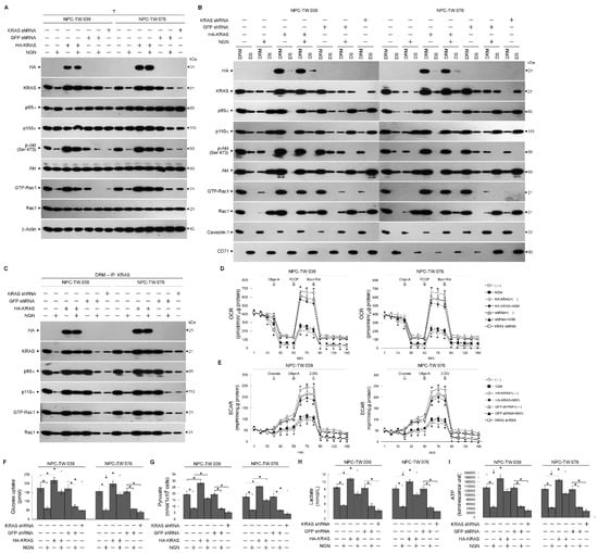 The action of NGN to decrease the ability of KRAS from interfering with the formation of the KRAS–p110α–p85α–GTP-Rac1 complexes in the lipid rafts promoted us to test whether the functions of glycolysis and mitochondrial OXPHOS were affected in the NPC cells. By employing a hemagglutinin (HA) epitope-tagged KRAS (HA-KRAS), elevated levels of KRAS–p110α–p85α–GTP-Rac1 complexes in the DRM fractions overcome the suppression of Akt (Ser 473) phosphorylation, Rac1 activation, and KRAS–p110α complex formation by NGN (Figure 3A–C). In addition, the impairment of glucose uptake, ECFR, mitochondrial OCR, pyruvate, lactate, and ATP generation was rescued by the overexpression of HA-KRAS (Figure 3D–I and Supplementary Tables S2.1 and S2.2). Similar to the NGN-treated cells, cells expressing KRAS short hairpin RNA (shRNA) resulted in decreased levels of lipid raft-associated KRAS–p110α–p85α–GTP-Rac1 complexes, KRAS, p-Akt (Ser 473), GTP-Rac1, glucose uptake, pyruvate, lactate, ATP, ECFR, and mitochondrial OCR compared with GFP shRNA-transfected cells (Figure 3A–I and Supplementary Tables S3.1 and S3.2). These results indicate that the suppression of bioenergetic generation by NGN occurs due to the attenuation of the formation of KRAS–PI3K–GTP-Rac1 complexes by reducing KRAS interaction with p110α.