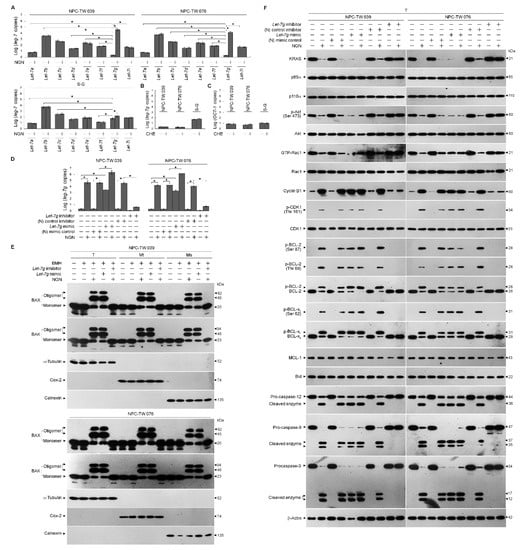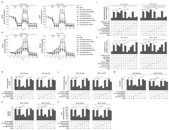 To confirm whether let-7g upregulation leads to a reduction in KRAS and whether it affects the regulatory effect of B cell lymphoma 2 (BCL-2)/ B-cell lymphoma-extra large (BCL-xL) on mitochondrial function, let-7g mimic and let-7g inhibitor were utilized to validate the abovementioned questions. The overexpression of the negative (N) mimic control did not influence the signaling and metabolic parameters of NPC cells, whereas let-7g mimic expression downregulated KRAS expression and caused impacts similar to those of NGN on the decreased levels of p-Akt (Ser 473), GTP-Rac1, mitochondrial OCR, ECAR, glucose uptake, intracellular glucose, pyruvate, lactate, and ATP (Figure 4F–O and Supplementary Tables S3 and S4). In line with NGN treatment, let-7g mimic also resulted in the induction of cyclin B1, cyclin dependent kinase 1 (CDK1) (Thr 161) phosphorylation, BCL-2 (Thr 69/Ser 87) phosphorylation, BCL-xL (Ser 62) phosphorylation, procaspase-3/-9/-12 cleavage, pro-apoptotic Bcl-2-associated x protein (BAX)/Bcl-2 antagonist killer 1 (BAK) oligomerization on the endoplasmic reticulum (ER)/mitochondria, cytosolic calcium (Ca++), and mitochondrial reactive oxygen species (ROS) (Figure 4E,F,I,J). The proteolytical process of Bid could not be triggered by NGN or let-7g mimic (Figure 4F). Compared with the (N) control inhibitor, let-7g inhibitor effectively inhibited endogenous let-7g expression and repressed the NGN-induced suppressive events; meanwhile, the activities of glucose uptake, cytosolic Ca++, mitochondrial ROS, glycolysis, mitochondrial OXPHOS, and ATP production recovered similar to those of vehicle-treated cells (Figure 4E–O and Supplementary Tables S4 and S5). Mitoquinone (MitoQ), a mitochondria-targeted antioxidant, completely inhibited NGN-induced mitochondrial ROS generation, whereas the non-antioxidant control decyltriphenylphosphonium bromide (DecylTPP) did not result in any suppression (Figure 4I). MitoQ partially inhibited the NGN-induced increase in cytosolic Ca++. Elevated Ca++ and ROS levels were ultimately be inhibited by dantrolene, an inhibitor of Ca++ channel proteins. The concentration of cytosolic Ca++ was higher than that of NGN-treated cells with the addition of ruthenium red, an inhibitor of mitochondrial Ca++ uptake (Figure 4J). However, the induction of mitochondrial ROS by NGN was significantly attenuated by ruthenium red (Figure 4I,J), indicating that NGN-induced ER-mitochondrial Ca++ flux contributed to mitochondrial oxidative stress. In contrast, S-G cells’ survival, OCR, and ECAR were unaffected by N mimic, let-7g mimic, or let-7g inhibitor overexpression, similar to NGN treatment (Supplementary Figure S1). These results indicate that impairment of the KRAS–PI3K–Rac1–Akt-modulated mitochondrial bioenergetics in NPC cells resulted from let-7g-suppressed KRAS expression.
