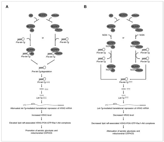 The present study’s results represent a significant advancement in understanding the modulation of ER−mitochondrial bioenergetics by the MCPIP1-modulated let-7g–KRAS–PI3K–Rac1–Akt signaling axis and provide a mechanistic explanation for the role of KRAS as a crucial regulator of metabolic reprogramming towards the coordination of aerobic glycolysis and mitochondrial OXPHOS in the energy generation of NPC cells. The inhibition of MCPIP1-mediated pre-let-7g cleavage by NGN promotes the suppression of KRAS expression by let-7g upregulation, decreasing the formation of the lipid raft-associated KRAS–PI3K–GTP-Rac1 complex, thereby attenuating the PI3K–Rac1–Akt-mediated signaling. The inactivation of Akt leads to impaired glucose metabolism regulation by GLUT-1 and compromised mitochondrial bioenergetics governed by BCL-xL/BCL-2.