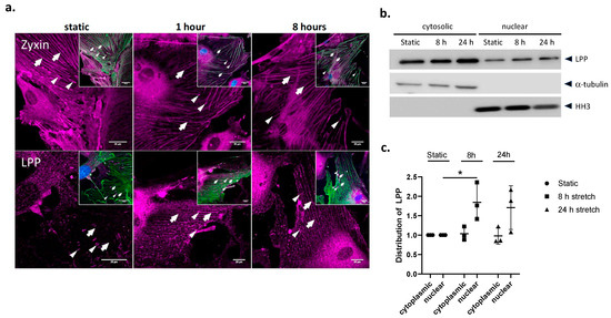 To test whether the sub-cellular distribution of LPP is affected by mechanical strain, the WT VSMCs were exposed to 13% cyclic stretching for 1 and 8 h, respectively (Figure 2a). In response to 1 h of stretching, LPP was more intensely and evenly localized to the stress fibres of the VSMCs. The concentrated staining of LPP at the FAs as seen in the static VSMCs was less intense in the stretched cells due to redistribution of LPP in response to the mechanical stimulus. In contrast, zyxin was localized to the stress fibres already under static conditions and this sub-cellular distribution did not change much after 1 or 8 h of stretching. There was no apparent translocation of zyxin or LPP to the nucleus of the stretched VSMCs after 1 or 8 h of exposure to cyclic stretching (Figure 2a). An additional Western blot analysis of the cytoplasmic and nuclear fraction of these cells revealed a moderate (approximately 1.7-fold) increase in the abundance of LPP in the nucleus following 8 and 24 h of exposure to cyclic stretching (Figure 2b,c). This nuclear translocation of LPP was less pronounced than that of zyxin (not shown) and collectively was too weak to be visualized by high-resolution laser scanning confocal microscopy.