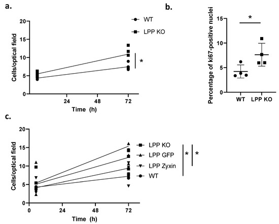 To investigate whether the overexpression of zyxin in LPP-KO VSMCs can compensate for the loss of LPP and thereby retransform them to the quiescent contractile phenotype, we transiently transfected LPP-KO VSMCs with a zyxin expression construct and monitored their rate of proliferation. The overexpression of zyxin resulted in about a three-fold increase in zyxin levels according to the Western blot analysis (cf. Figure S2), and while the non-transfected cells again showed the highest rate of proliferation (Figure 3c), this was normalized to below the level of the GFP-transfected control VSMCs upon zyxin overexpression.