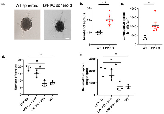 LPP-KO VSMCs and WT VSMCs grown in 3D spheroids embedded in collagen gels form sprouts and invade the collagen gel. (a) Representative images, the scale bar represents 50 µm. (b) Summary of the average number of sprouts produced by individual LPP KO VSMC (n = 6, in red) and WT VSMC preparations (n = 4) with >10 spheroids per VSMC preparation analysed using the cellSens software. (c) Summary of the cumulative distance travelled by individual sprouts of a VSMC spheroid. n = 6 and n = 4 as in (b), * p < 0.05, ** p < 0.01 as indicated in (b,c) Transient overexpression of zyxin and eGFP in LPP-KO VSMCs and their effect on (d) the average number of sprouts and (e) cumulative sprout length. Each data point represents an individual VSMC preparation with >10 spheroids per VSMC preparation analysed. n = 3, * p ˂ 0.05 as indicated.