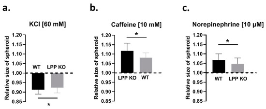 The application of caffeine alone (10 mM) did not produce a contraction as might have been expected by the initial Ca2+ release from the intracellular calcium stores. Instead, caffeine initiated a slow relaxation, peaking at about 3 min, with an increase in the ‘size’ of the VSMC spheroids ranging from 5 to 14%. The LPP-KO VSMC spheroids reacted with a significantly attenuated functional response to caffeine as compared to that of their WT counterparts (Figure 5b). While caffeine enhances the Ca2+ sensitivity of the ryanodine receptors that become activated by basal intracellular Ca2+ levels, resulting in the release and depletion of intracellular Ca2+ stores, caffeine also promotes vasodilation by acting as an inhibitor of phosphodiesterase activity [18]. In addition, caffeine inhibits myosin light chain kinase (MLCK) and actin–myosin interactions [19,20] and thereby promotes dilation, as we observed in the VSMC spheroids.