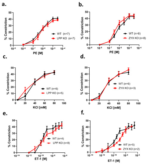 To determine whether resistance-sized arteries isolated from LPP knockout mice exhibit normal contractile responses to vasoactive agonists, first a concentration–response curve for the α1-adrenoreceptor agonist phenylephrine (PE) was established. The MA segments from the LPP-KO mice responded to PE in a concentration-dependent manner with a similar EC50 value and the same maximum response as their WT counterparts (Figure 7a). Similar results were obtained with MA segments isolated from zyxin-deficient mice (ZYX-KO) (Figure 7b). We further employed KCl to depolarize the native VSMCs. As shown in Figure 7c, there was no difference in the magnitude of the responses to KCl between MA segments isolated from the WT or LPP-KO mice. Similarly, the vasoconstrictor response of the MA segments derived from the zyxin-KO mice to KCl was not different as compared to that of their WT counterparts (Figure 7d). Finally, we established a concentration–response curve to endothelin-1 (ET-1), which was not different between the LPP-KO and WT MA segments (Figure 7e). The same held true for the ZYX-KO and WT MA segments (Figure 7f).