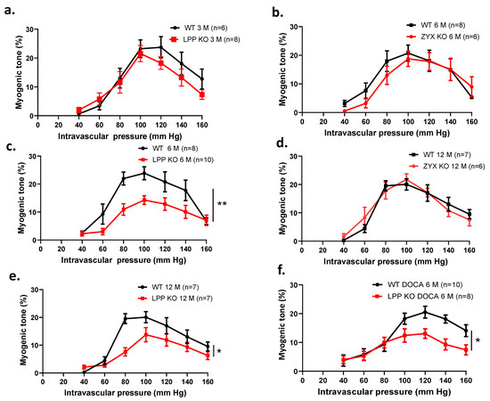 Comparison of the myogenic responses of 3rd-order mesenteric artery segments isolated from WT, LPP-KO or ZYX-KO mice. The number of isolated perfused segments derived from individual mice is indicated on the graphs. (a) Pressure–response curves for segments of (a) 3-month-old, (c) 6-month-old and (e) 12-month-old WT and LPP-KO mice; (b) 6-month-old and (d) 12-month-old WT and ZYX-KO mice; and (f) 6-month-old WT and LPP-KO mice made hypertensive using the DOCA-salt model of experimental hypertension. The area under the curve (AUC) was calculated for each individual group. * p ˂ 0.05, ** p ˂ 0.01 as indicated.