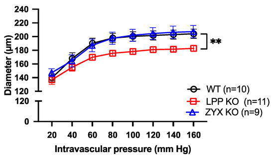 Passive pressure–diameter curves of 3rd-order MA segments isolated from WT, LPP-KO or ZYX-KO mice. The curves were generated in Ca2+-free physiological saline solution in the presence of EGTA. The number of isolated perfused segments derived from individual mice is indicated on the graph. ** p ˂ 0.01 as indicated.