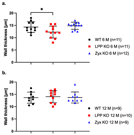 We next asked whether the activated synthetic phenotype of LPP-KO VSMCs in culture is reflected by medial hyperplasia and thus an increased thickness of the vessel wall in MA segments isolated from LPP-KO mice. Such changes would have an impact on wall stress and hence affect the functional responses of the blood vessel to increased (blood) pressure. We therefore measured the thickness of the MA wall at 80 mm Hg. In MA segments isolated from 6-month-old mice, the thickness of the vessel wall was significantly smaller in LPP-KO mice as compared to their WT counterparts (Figure 11a). The thickness of the vessel wall of MA segments derived from the ZYX-KO mice was not different from that of the WT mice (Figure 11a). In MA segments derived from 12-month-old mice, there was no difference in wall thickness between the LPP-KO, WT or ZYX-KO mice (Figure 11b).