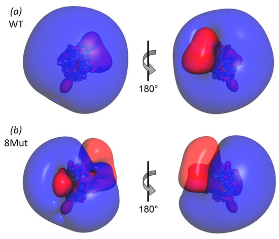Isoelectric surfaces of CytC WT (a) and 8Mut (b). Blue and red surfaces correspond to charge +0.1 mV and −0.1 mV, respectively. Orientation of the molecules is the same as in Figure 1.