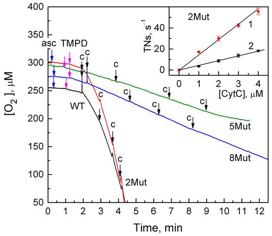 Typical oxygen consumption kinetics of CcO oxidizing CytC in the presence of TMPD and ascorbate: WT (black line) and CytC mutants: 2Mut (red line), 5Mut (green line), and 8Mut (blue line). The final concentrations in the measurement medium were CcO, 24 nM (black line) and 120 nM (red, green, and blue lines); ascorbate (5 mM); TMPD (0.1 mM). The addition of cytochromes (1 µM each) is marked with arrows with the letter c. The inset shows the dependences of the oxygen consumption rate on the concentration of CytC 2Mut, obtained in the presence of TMPD (1, red dots) and without it (2, black dots).