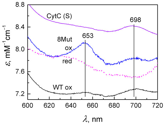 The absorption spectra of the studied mutant CytC virtually did not differ from the spectra of CytC WT either in the position or in the magnitude of the peaks. However, small differences were observed in the ferric forms of proteins in the far-red region (Figure 6). The ferric form was obtained by adding substoichiometric amounts of ferric cyanide, since the original protein preparations were in different redox states. Ferric CytC has a weak (about 0.2 mM−1cm−1) peak with a charge transfer at 695–698 nm, reflecting the state of the Met80 bond with heme iron. It can be seen that the peak at 695–698 nm for recombinant cytochromes is slightly smaller (the maximum value is about 0.13 mM−1 cm−1) than for native CytC isolated from horse heart. Approximately the same picture is typical of other mutant cytochromes. Furthermore, all recombinant cytochromes have a new absorption peak at 653 nm, which is absent in native CytC from horse heart. For CytC 8Mut (red line), this peak is 0.35 mM−1 cm−1, which is two to three times higher than the peak at 695 nm, while in the case of CytC WT (blue line) and other mutants, their amplitudes are approximately equal. The peak at 653 nm is also present only in the ferric form and disappears when the protein is reduced (dotted red line).