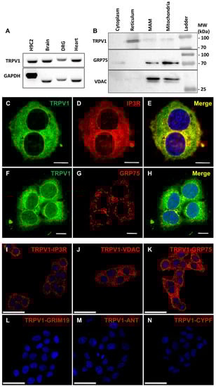 Using proximity ligation assay (PLA) as a third approach to confirm TRPV1 presence in MAMs, we demonstrated proximity between TRPV1 and either IP3R (ER marker, Figure 1I) or VDAC (OMM (outer mitochondrial membrane) marker, Figure 1J) or GRP75 (ER–mitochondrial linker, Figure 1K), whereas no protein interaction was detected between TRPV1 and GRIM19 (nuclear marker; Figure 1L), ANT (IMM (inner mitochondrial membrane) marker; Figure 1M), or CypF (mitochondrial matrix marker; Figure 1N).