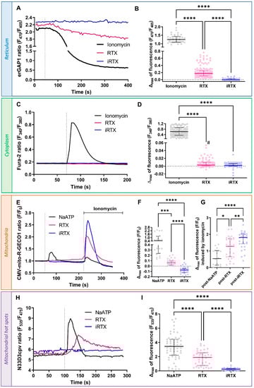 Acute effect of TRPV1 modulation on Ca2+ homeostasis. (A,B) Reticular Ca2+ concentration ([Ca2+]r). (A) Time traces showing [Ca2+]r measured with erGAP1 probe during ionomycin (1 µM; black line), resiniferatoxin (RTX) stimulation (10 µM; pink line), or 5′-iodoresiniferatoxin (iRTX) stimulation (10 µM; blue line). (B) Scatter plots representing reticular Ca2+ content assessed by ionomycin (1 µM; black; n = 156), RTX (10 µM; pink; n = 69), or iRTX (10 µM; blue; n = 42) stimulation. (C,D) Cytosolic Ca2+ concentration ([Ca2+]c). (C) Time traces showing [Ca2+]c measured with Fura-2 AM probe during ionomycin (1 µM; black line), RTX (10 µM; pink line), or iRTX (10 µM; blue line) stimulation. (D) Scatter plots representing cytosolic Ca2+ content assessed by ionomycin (1 µM; black; n = 156), RTX (10 µM; pink; n = 105), or iRTX (10 µM; blue; n = 74) stimulation. (E–G) Mitochondrial Ca2+ concentration ([Ca2+]m). (E) Time traces showing [Ca2+]m measured with CMV-mito-R-GECO1 probe during NaATP (100 µM; black line), RTX (10 µM; pink line), or iRTX (10 µM; blue line) stimulation. (F) Scatter plots representing mitochondrial Ca2+ content assessed by NaATP (100 µM; black; n = 21), RTX (10 µM; pink; n = 32), or iRTX (10 µM; blue; n = 31) stimulation. (G) Scatter plots representing mitochondrial total Ca2+ content assessed by ionomycin (1 µM) after NaATP (black; n = 21), RTX (pink; n = 32), or iRTX (blue; n = 31) stimulation. (H,I) Ca2+ concentration in mitochondrial hot spots ([Ca2+]hot spots). (H) Time traces showing [Ca2+]hot spots measured with N33D3cpv probe during RTX (10 µM; pink line), iRTX (10 µM; blue line), or NaATP (100 µM; black line) stimulation. (I) Scatter plots representing Ca2+ content in mitochondrial hot spots assessed by NaATP (100 µM; black; n = 58), RTX (10 µM; pink; n= 40), or iRTX (10 µM; blue; n = 43) stimulation. Data are from at least three independent experiments. Statistics: * p < 0.05, ** p < 0.01, *** p < 0.001, **** p < 0.0001; # p < 0.05, RTX vs. iRTX Mann–Whitney test.