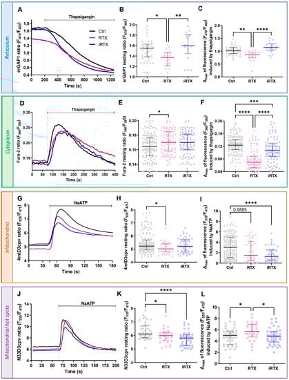 Effects of 30 min prolonged TRPV1 modulation on Ca2+ homeostasis. (A–C) Reticular Ca2+ concentration ([Ca2+]r. (A) Time traces showing [Ca2+]r measured with erGAP1 probe during thapsigargin stimulation (2 µM) from control cells (Ctrl, black line) and 30 min-pretreated cells with RTX (10 µM; pink line) or iRTX (10 µM; blue line). (B) Scatter plots representing the steady-state [Ca2+]r concentration and (C) the total reticular Ca2+ content assessed by thapsigargin (2 µM) from control cells (black; n = 45) and 30 min-pretreated cells with RTX (10 µM; pink; n = 16) or iRTX (10 µM; blue; n = 18). (D–F) Cytosolic Ca2+ concentration ([Ca2+]c. (D) Time traces showing [Ca2+]c measured with Fura-2 AM probe during thapsigargin stimulation (2 µM) from control cells (black line) and 30 min-pretreated cells with RTX (10 µM; pink line) or iRTX (10 µM; blue line). (E) Scatter plots representing the steady-state [Ca2+]c and (F) the total cytosolic Ca2+ content assessed by thapsigargin (2 µM) from control cells (black; n = 150) and 30 min-pretreated cells with RTX (10 µM; pink; n = 92) or iRTX (10 µM; blue; n = 103). (G–I) Mitochondrial Ca2+ concentration ([Ca2+]m. (G) Time traces showing [Ca2+]m measured with 4mtD3cvp probe during NaATP stimulation (100 µM) from control cells (black line) and 30 min-pretreated cells with RTX (10 µM; pink line) or iRTX (10 µM; blue line). (H) Scatter plots representing the steady-state [Ca2+]m and (I) the total mitochondrial Ca2+ content assessed by NaATP (100 µM) from control cells (black; n = 151) and 30 min-pretreated cells with RTX (10 µM; pink; n = 32) or iRTX (10 µM; blue; n = 53). (J–L) Ca2+ concentration in mitochondrial hot spots ([Ca2+]hot spots). (J) Time traces showing [Ca2+]hot spots measured with N33D3cpv probe during NaATP stimulation (100 µM) from control cells (black line) and 30 min-pretreated cells with RTX (10 µM; pink line) or iRTX (10 µM; blue line). (K) Scatter plots representing the steady-state [Ca2+]hot spots and (L) total Ca2+ content in mitochondrial hot spots by NaATP (100 µM) from control cells (black; n = 42) and 30 min-pretreated cells with RTX (10 µM; pink; n = 28) or iRTX (10 µM; blue; n = 44). Data are from at least three independent experiments. Statistics: * p < 0.05, ** p < 0.01, *** p < 0.001, **** p < 0.0001.
