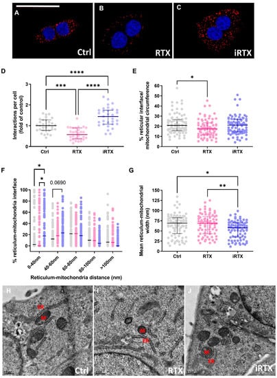 Effects of 30 min prolonged TRPV1 modulation on interactions between endoplasmic reticulum and mitochondria. (A–C) Representative confocal microscopy images of in situ IP3R–VDAC interactions depicted as red dots (A) in control cells and 30 min-pretreated cells with (B) RTX (10 µM) or (C) iRTX (10 µM). Nuclei appear in blue. Scale bar: 50 µm. (D) Quantification of the interactions per cell presented as a fold of control; n = 30–31 cells. (E–J) Ultrastructural analysis by electron microscopy of reticulum–mitochondria interactions in control cells (black; n = 83) and in 30 min-pretreated cells with RTX (10 µM; pink; n = 73) or iRTX (10 µM; blue; n = 79). Schematics of the different parameters measured are explained in Figure S5. (E) Quantification of reticulum–mitochondria interface expressed as a percentage of the mitochondrial circumference. (F) Frequency distribution of reticulum–mitochondria interactions. (G) Mean of the reticulum–mitochondria interaction width. (H–J) Representative images of electron microscopy in control cells (H) and 30 min-pretreated cells with RTX (I) or iRTX (J). M, mitochondria; ER, endoplasmic reticulum. Data are from at least three independent experiments. Statistics: * p < 0.05, ** p < 0.01, *** p < 0.001, **** p < 0.0001.