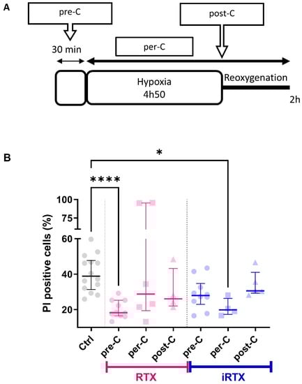 Based on the literature, different conditioning strategies were used during the H/R sequence []. As resiniferatoxin (RTX) and 5′-iodoresiniferatoxin (iRTX) were prepared diluted in DMSO (1/10,000), our negative control was obtained with DMSO, which did not affect the percentage of dead cells compared to without DMSO (control condition; Figure S1A). Preconditioning (pre-C) was induced by applying the TRPV1 agonist or antagonist 30 min before the sequence of H/R. Postconditioning (post-C) was generated by applying a TRPV1 agonist or antagonist at the onset of reoxygenation. In addition, a per-conditioning (per-C) sequence was induced by applying the TRPV1 agonist or antagonist at the beginning of hypoxia and leaving it during the entire sequence of H/R.