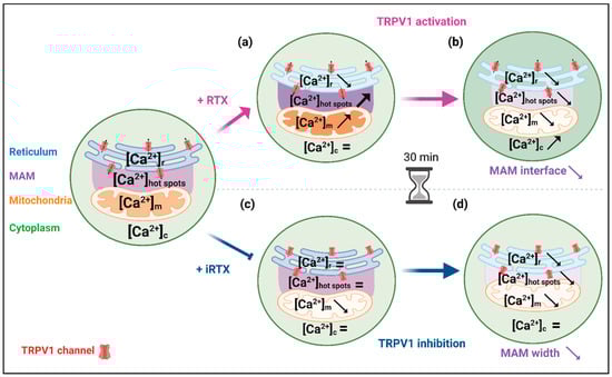 Schematic summary of the main results. (a) Acute TRPV1 activation induced a slow decrease in the reticular Ca2+ content. It led to a Ca2+ increase at the mitochondrial surface and within the mitochondrial matrix, with an almost imperceptible cytosolic Ca2+ change at the whole-cell level. (b) When TRPV1 activation was prolonged for 30 min, [Ca2+]r dropped, reducing the MAM interface and decreasing mitochondrial Ca2+ content (matrix and surface) in favor of an increase in the cytosol. (c) Acute TRPV1 inhibition had no apparent effect on reticulum, cytosol, and mitochondrial hot spot contents, probably due to a SERCA pumping adaptation, but slowly depleted the mitochondrial compartment of Ca2+. (d) Over 30 min, TRPV1 inhibition increased and brought the ER–mitochondria interactions closer. We could expect an increase in [Ca2+]m in this condition. It was not the case, as the amount of Ca2+ released from the reticulum was slightly lowered. The figure was created with BioRender.com (agreement number: JH25TUV6AR).