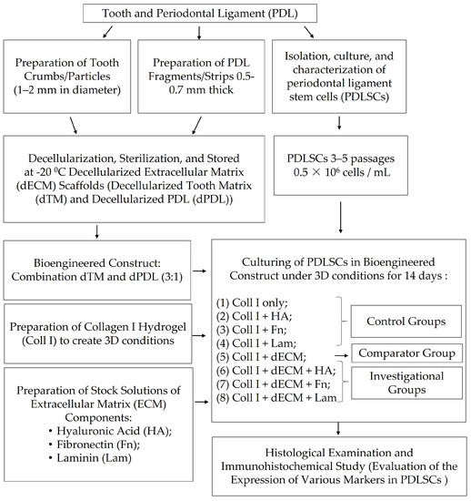 Sample collection was performed after obtaining written informed consent. A total of 1–3 molars that were free from caries and restorations were randomly collected from patients aged from 18 to 25 years under the approved guidelines set by the Ethics Committee of the A.I. Evdokimov Moscow State University of Medicine and Dentistry (protocol code 03/20 from 18 March 2020). The tooth particles and the PDL strips were prepared according to the procedures previously described [29]. Briefly, the tissues of the PDL were separated from the surface of the middle third of the tooth root under aseptic conditions. Strips 0.5–0.7 mm thick were cut and stored at −20 °C. The teeth were then washed with chlorhexidine. The teeth were sectioned at the cementum–enamel junction and particles (from 1 to 2 mm) were formed from the remaining tooth roots using an electric mill (Bosch MKM 6000, Görlingen, Germany). Quality control of samples was carried out through a dental microscope (Seiler, St. Louis, MO, USA) at a magnification of ×8.