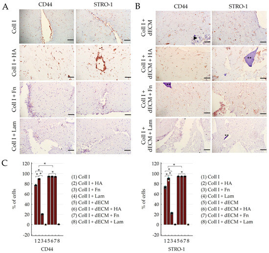 Evaluation of the expression of stem cell markers (CD44, STRO-1) in PDLSCs cultured under 3D conditions for 14 days: (A,B) Immunohistochemical staining of PDLSCs cultured without scaffolds (A) and with decellularized scaffolds (B) in collagen I hydrogel. The positive cells have a brown color. The nuclei were counterstained with hematoxylin. Two asterisks indicate dTM; an arrowhead indicates dPDL. Scale bars, 100 µm; (C) Morphometric analysis of the percentage of cells stained with CD44 and STRO-1 in different groups; M ± SEM, n = 5. The difference between the values in the groups was statistically significant (* p < 0.001).