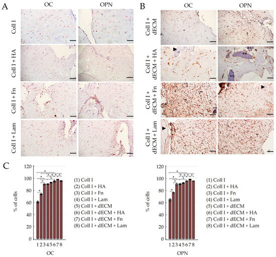 Evaluation of the expression of osteogenic (OC, OPN) differentiation markers in PDLSCs cultured under 3D conditions for 14 days: (A,B) Immunohistochemical staining of PDLSCs cultured without scaffolds (A) and with decellularized scaffolds (B) in collagen I hydrogel. The positive cells have a brown color. The nuclei were counterstained with hematoxylin. Two asterisks indicate dTM; an arrowhead indicates dPDL. Scale bars, 100 µm; (C) Morphometric analysis of the percentage of cells stained with OC and OPN in different groups; M ± SEM, n = 5. The difference between the values in the groups was statistically significant (* p < 0.001).