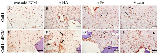 In this study, we evaluated the effect of adding individual ECM components (HA, Fn, and Lam) to the dECM (a combination of dTM and dPDL) in collagen hydrogel. Cultivation of PDLSCs in collagen I hydrogel mimics in vivo conditions and induces different cell behavior when interacting with the dECM, which is absent in 2D culture [25,29].