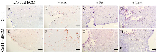As already mentioned, the tissue-specific properties of the ECM are manifested in a wide variety of matrix macromolecules. Despite the diversity of these molecules, the main constituents of the ECM are hydrated glycosaminoglycan (hyaluronic acid, HA) and fiber-forming proteins such as collagens, elastin, Fn, and Lam [30]. The exogenous addition of key ECM components (HA, Fn, and Lam) has been shown to actively influence cell adhesion, migration, proliferation, and differentiation [31,32,33,34].