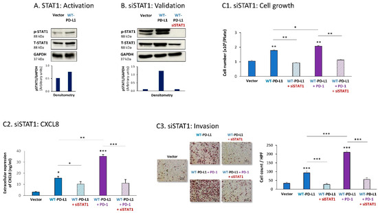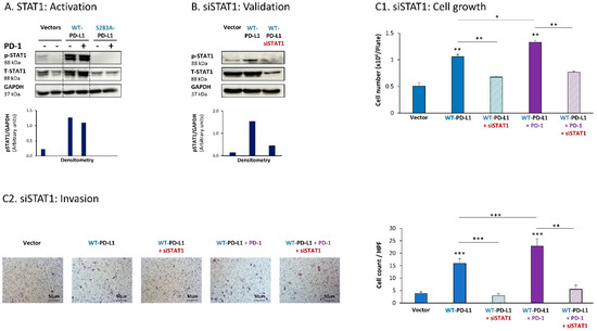Following these observations, siSTAT1 (validated in Figure 2B) was found to prominently down-regulate the ability of PD-L1—in its cell-autonomous and PD-1-induced functions—to induce the pro-metastatic functions of cell growth and invasion of the cells (Figure 2C1,C2, respectively).