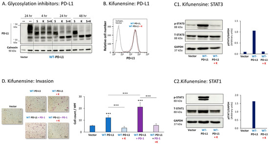 Due to its more prominent effects on PD-L1 N-linked glycosylation, the effects of kifunensine on the pro-tumorigenic functions of PD-L1 were determined. After verifying that the expression levels of PD-L1 at the cell membrane remained intact following kifunensine treatment (Figure 5B), we found that the inhibitor has almost completely reduced the PD-L1-induced elevation in STAT3 and STAT1 activation in WT-PD-L1-expressing cells (Figure 5C). Moreover, kifunensine has markedly reduced the cell-autonomous and PD-1-induced abilities of PD-L1 to promote tumor cell invasion (Figure 5D; cell proliferation was not affected by kifunensine).