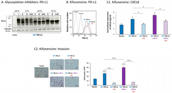 Inhibition of N-linked glycosylation leads to reduced PD-L1 glycosylation and to lower PD-L1-induced pro-metastatic effects in MDA cells, in vitro. (A) The effects of N-linked glycosylation inhibitors on PD-L1 glycosylation in WT-PD-L1-MDA cells. The cells were treated with kifunensine (termed “K”; 50 μM) and/or swainsonine (termed “S”; 50 μM) for different time points (compared with vehicle control at 24 h), as demonstrated in the figure. PD-L1 expression was determined by WB, using calnexin as loading control. (B) PD-L1 cell surface expression in WT-PD-L1-MDA, treated with kifunensine or its vehicle, and in vehicle-treated Vector-MDA cells. PD-L1 expression was determined by flow cytometry. Non-relevant isotype-matched antibodies were used as an isotype control. (C) The effects of kifunensine on functions of WT-PD-L1-MDA cells. Cell functions were determined in WT-PD-L1-MDA cells treated with kifunensine or its vehicle (72 h). (C1) CXCL8 production, determined by ELISA. (C2) Tumor cell invasion, in transwells. HPF—High-power field. Size bar, 50 μm. *** p < 0.001, * p < 0.05. Asterisks above bars denote statistical significance compared with Vector-MDA cells. In panels A and C, the results are from a representative experiment of n = 3, and in panel B of n = 2, showing similar results.