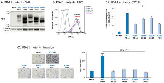 The in vitro pro-metastatic effects of PD-L1 in MDA cells require N-linked glycosylation of PD-L1 at all four sites. The phenotypes and functions of MDA cells expressing WT-PD-L1 or PD-L1 variants, mutated singly at each of the four N-linked glycosylation sites (N35A-PD-L1, N192A-PD-L1, N200A-PD-L1 and N219A-PD-L1) were determined in parallel with Vector-MDA cells. (A) PD-L1 expression, determined by WB using calnexin as loading control. (B) PD-L1 cell surface expression, determined by flow cytometry (FACS). Non-relevant isotype-matched antibodies were used as an isotype control. (C) Tumor cell functions. (C1) CXCL8 production, determined by ELISA. (C2) Tumor cell invasion, in transwells. HPF—High-power field. Size bar, 50 μm. *** p < 0.001, ** p < 0.01, * p < 0.05. Asterisks above bar denote statistical significance compared with Vector-MDA cells. In all panels, the results are from a representative experiment of n = 3, showing similar results.