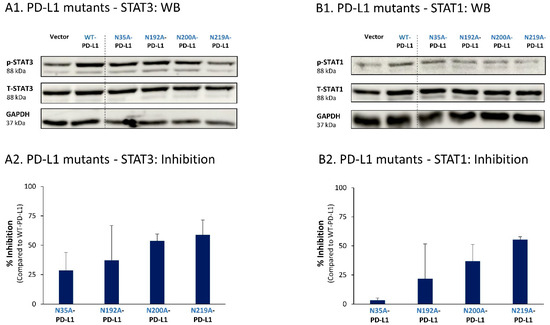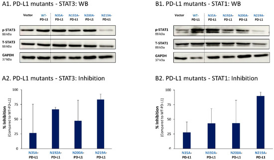 Densitometry graphs of STAT3 and STAT1 activation were generated with the ImageJ software (Version 1.53t); they present arbitrary units of pSTAT3/GAPDH or pSTAT1/GAPDH values in cells expressing WT-PD-L1 or different PD-L1 N-linked glycosylation mutants. % inhibition of STAT3 and STAT1 activation in PD-L1 mutants compared to WT-PD-L1 were calculated as “1 minus [the value of STAT3 or STAT1 activation in a PD-L1 mutant, divided by the value of STAT3 or STAT1 activation in WT-PD-L1]”.