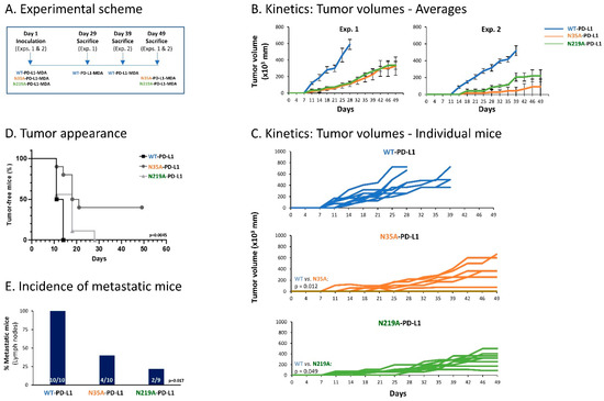 The findings of Figure 11 clearly indicate that impairment of PD-L1 N-linked glycosylation significantly reduced the tumorigenic and metastatic potential of the tumor cells. Kinetics and tumor volume analyses demonstrated a more rapid growth of WT-PD-L1-MDA cells than of N35A-PD-L1-MDA cells and N219A-PD-L1-MDA cells; also, mice injected with WT-PD-L1-expressing cells developed larger tumors than mice injected with N35A-PD-L1-MDA cells and N219A-PD-L1-MDA cells (Figure 11B–D). Metastases were detected mainly in lymph nodes adjacent to the mammary fat pad in which tumor cells were administered to the mice. The findings of Figure 11E indicate that the incidence of mice with lymph node metastases was significantly higher in mice injected with WT-PD-L1-MDA cells than in mice injected with N35A-PD-L1-MDA cells and N219A-PD-L1-MDA cells.