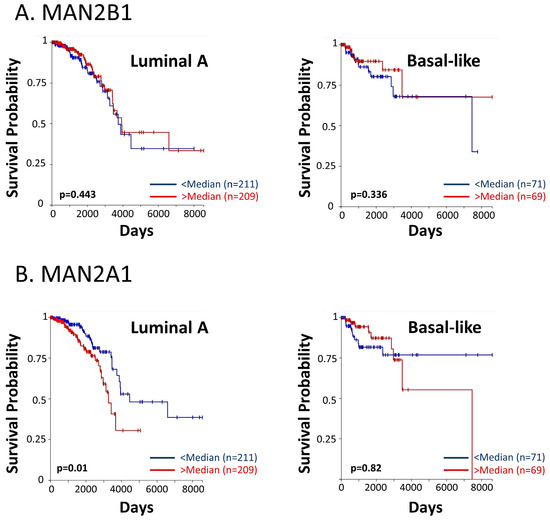These findings have led us to analyze the associations between patient survival and key enzymes that take part in the N-linked glycosylation process. Using the TCGA dataset, we analyzed the two mannose-trimming enzymes α-mannosidases I and II (inhibited by kifunensine and swainsonine, respectively), and their associations with overall survival of breast cancer patients of the luminal A and basal-like subtypes (in the PAM50 categorization, the basal-like subtype corresponds mainly to the TNBC subtype). The findings of Figure 12 provide evidence for significant associations between the expression levels of α-mannosidase II (MAN2A1) and patient overall survival in the luminal A subtype. A similar trend was revealed in the basal-like subtype (Figure 12), although not reaching statistical significance due to the low numbers of TNBC patients that were included in the dataset. For both breast cancer subtypes, the results of progression-free intervals are demonstrated in Figure S3.