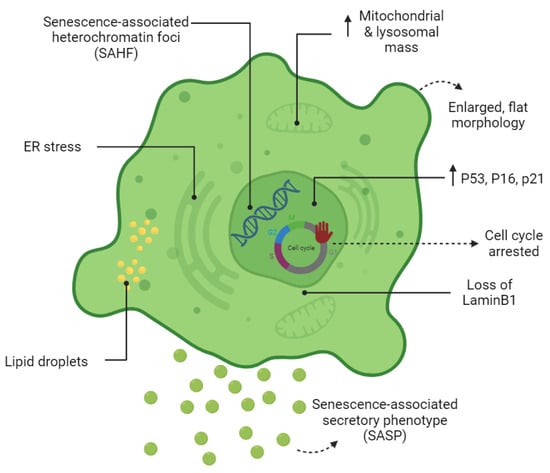 Cell cycle arrest, regardless of the cell type, is the primary feature of senescent cells. However, growth cessation is not an exclusive characteristic of senescent cells, being also observed in cellular quiescence and terminally differentiated cells.