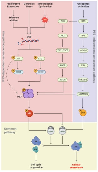 During cellular senescence, growth arrest occurs through the activation of both the p53/p21(CIP1/WAF1) and p16INK4a/RB signaling pathways (Figure 2). In the p53-dependent senescence pathway, telomere attrition or elevated ROS levels, generated by intrinsic and extrinsic stimuli such as genotoxic stress and mitochondrial dysfunction, result in DNA damage and activation of the DNA damage response (DDR) pathway [38]. The DDR network involves different regulatory proteins including ATM/ATR, CHK1/CHK2, p53, and p21(CIP/WAF1). ATR/CHK1 and ATM/CHK2 signaling are usually activated by single-strand and double-strand DNA breaks (DSBs), respectively [39,40,41]. p53 phosphorylation is induced in both pathways, which allows its binding to the CDKN1A promoter and upregulation of p21(CIP/WAF1) expression. The latter induces senescence by inhibiting the kinase activity of cyclin-CDK complexes and RB phosphorylation [42]. In the p53-independent senescence pathway, the CDK4/6-CyclinD complexes are directly inhibited by p16INK4a and lose their regulatory effects on RB phosphorylation (Figure 2). Dephosphorylated RB binds to the E2F and induces cellular senescence [43].