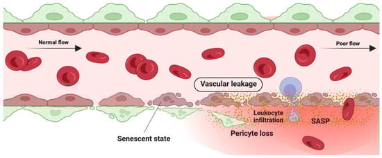 Retina blood vessel is made up of three distinct layers of the tunica intima, the tunica media, and the tunica adventitia. The tunica adventitia consists of fibroblast cells, while the tunica media is hosting smooth muscle cells. The tunica intima, the thinnest layer of the vascular wall, is composed of one layer of endothelial cells (ECs) and a basement membrane. ECSs not only act as a physical barrier but also participate in the regulation of vascular homeostasis, vessel tone, inflammatory responses, and neovascularization [151]. A previous study by Bertelli et al. demonstrated that long-term high glucose exposure stimulates premature senescence in human retinal ECs [152]. Senescent ECs displayed limited replicative potential and increased susceptibility to pathological attacks [153]. Losing replicative potential inhibits cell endothelialization and declines the repair function of vessels [153]. The presence and accumulation of senescent vascular cells also results in a leaky and highly permeable endothelium, allowing immune cells and circulating non-immune cells to enter the surrounding tissue and provoke a low-grade inflammatory state [154,155,156]. In both in vivo and in vitro studies of the blood-brain barrier (BBB) model, the accumulation of senescent vascular cells is accompanied by lower barrier integrity [157]. A study by Venkatesh et al. also demonstrated that EC senescence is associated with increased permeability due to the alteration of vascular endothelial (VE)-cadherin and β-catenin expression and localization [158]. Krouwer et al. provided further evidence for the detrimental effect of senescent ECs where the presence of replicative senescence in a non-senescent endothelial monolayer impaired both adherence and tight junctions and compromised the integrity of the endothelial barrier [159]. Altogether, these studies indicate that the senescence phenotype of ECs is associated with lower barrier integrity in retinal blood vessels (Figure 4).