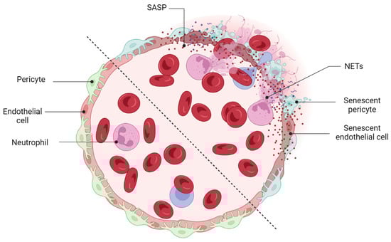 Although NETosis is beneficial for clearing diseased senescent vasculature, excessive NET formation may contribute to the development of conditions such as diabetes and its complications, like diabetic retinopathies (DRs) [192]. Hyperglycemia, both in vivo and in vitro, increases NET formation [193,194]. In addition, a significant surge in circulating NETosis markers (MPO, NE) has been documented in the serum of individuals with proliferative diabetic retinopathy (PDR) [195]. The specific mechanism by which high glucose induces NET formation in DR patients and how NET formation contributes to the pathogenesis of DR has not been fully elucidated. However, a recently published study by Wang et al. has proposed that long-term hyperglycemia induces the formation of NETs through an NADPH oxidase-dependent pathway in diabetic patients [192].