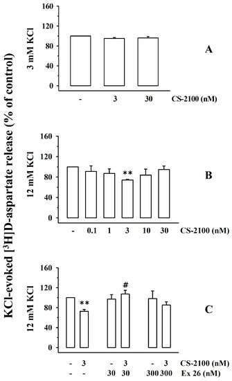 Effects of the S1P1R agonist, CS-2100, on the spontaneous and KCl-evoked release of [3H]D-aspartate from mouse cortical synaptosomes: reversal by the S1P1R antagonist Ex 26. Synaptosomes from the cortex of healthy mice were preloaded with [3H]D-aspartate and then superfused under resting (3 mM KCl, (A)) or depolarizing (12 mM KCl, (B,C)) conditions. Results are expressed as the percentages of the respective controls (the spontaneous (A) and KCl-evoked (B,C) tritium release in the absence of the ligands). Data are means ± SEM of at least five experiments run in triplicate; ** p < 0.01 vs. 12 mM KCl-evoked tritium overflow; # p < 0.05 vs. 12 mM KCl/3 nM CS-2100 (3 nM)-evoked tritium overflow.