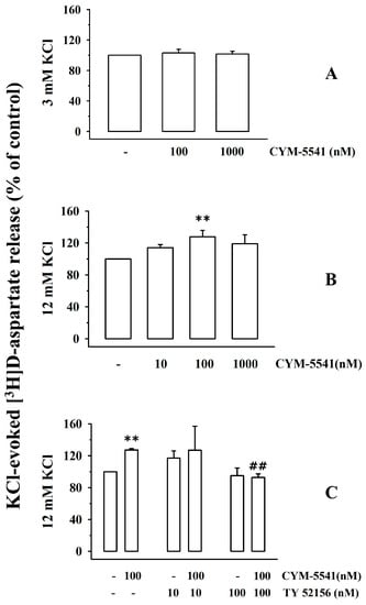 Effect of the S1P3R agonist, CYM-5541, on the spontaneous and KCl-evoked release of [3H]D-aspartate from mouse cortical synaptosomes. Reversal by the S1P3R antagonist, TY-52156. Synaptosomes from the cortex of healthy mice were preloaded with [3H]D-aspartate and then superfused under resting (3 mM KCl, (A)) or depolarizing (12 mM KCl, (B,C)) conditions. Results are expressed as percentages of the respective controls (the spontaneous (A) and KCl-evoked (B,C) tritium release in the absence of ligands). Data are means ± SEM of at least five experiments run in triplicate; ** p < 0.01 vs. 12 mM KCl-evoked tritium overflow; ## p < 0.01 vs. 12 mM KCl/100 nM TY-52156-evoked tritium overflow.