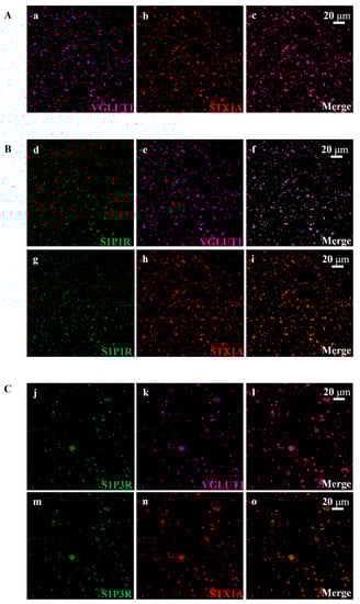 S1P1R and S1P3R located on glutamatergic nerve terminals isolated from the cortex of control mice. (A) Colocalization (c, merge, purple) of vesicular glutamate transporter type 1 (VGLUT1, a magenta) and syntaxin-1a (STX1A, b, red). (B) Colocalization (f, merge, pink) of S1P1R (d, green) and VGLUT1 (e, magenta) and colocalization (i, merge, yellow) of S1P1R (g, green) and STX1A (h, red) in mouse cortical synaptosomes. (C) Colocalization (l, merge, pink) of S1P3R (j, green) and VGLUT1 (k, magenta) and colocalization (o, merge, yellow) of S1P3R (m, green) and STX1A (n, red) in mouse cortical synaptosomes. The figure shows representative images of at least five independent experiments carried out on different samples.
